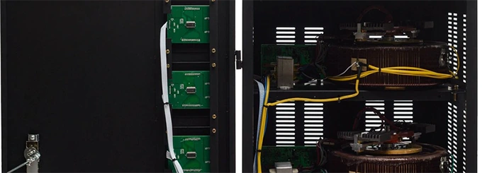 На ЖК-дисплеях отображаются параметры тока, частоты, входного и выходного напряжения по всем трем фазам, сообщения о проблемах.