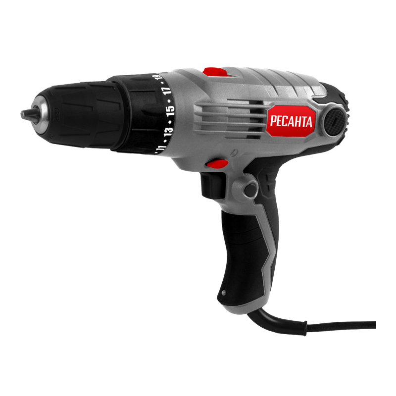 Скорость вращения шпинделя регулируется плавным нажатием на клавишу пуска. Максимальная частота зависит от выбранной передачи – 450 об/мин или 1500 об/мин. Переключение редуктора выполняется регулятором в верхней части корпуса. При длительных работах кнопку можно зафиксировать в выбранном положении с помощью блокиратора на рукоятке.Крутящий момент устанавливается с помощью поворотного колеса в передней части корпуса. Всего доступно 19 ступеней, а также режим сверления. Это позволяет адаптировать сетевой шуруповерт Ресанта под различные задачи – от сборки металлических конструкций до завинчивания шурупов в деревянные балки.