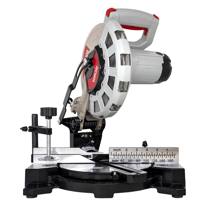 Менять оснастку не сложно благодаря функции блокировки шпинделя. Мощность устройства составляет 1,6 кВт, что обеспечивает скорость вращения диска до 5000 об/мин. Это позволяет прикладывать меньше усилий и получать чистую линию реза. Точно отрегулировать угол распила помогает встроенная линейка.